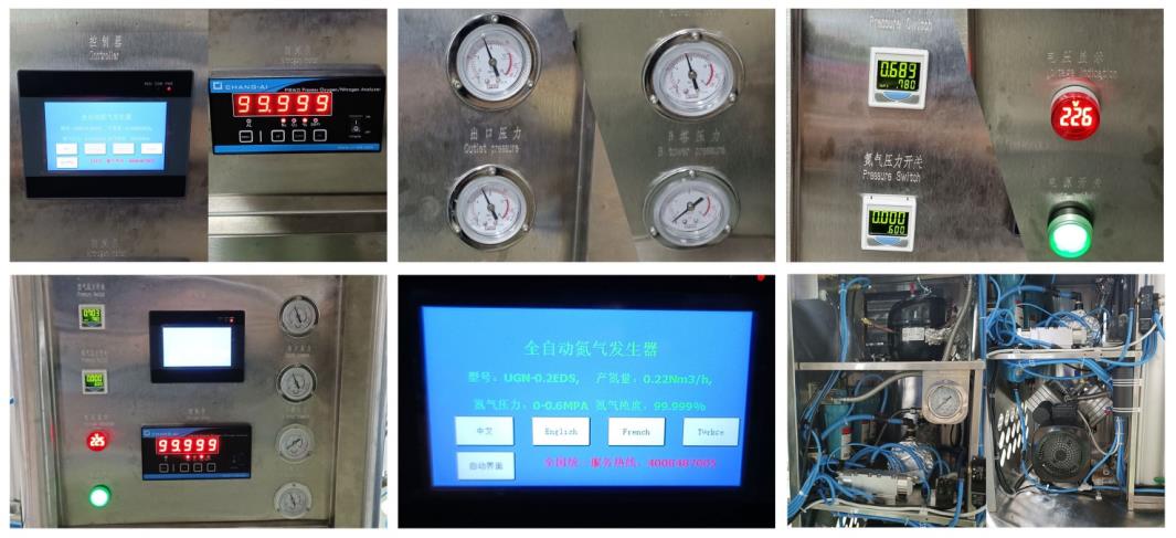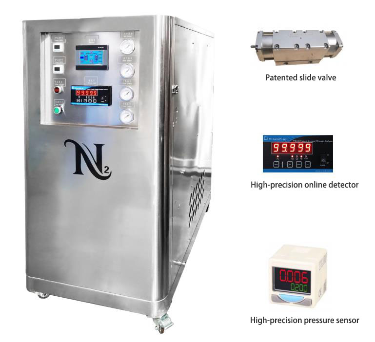 This model has a nitrogen purity of 99.999%and is generally used for laboratory research(chemical pharmaceutical industry). It uses the companys patented valve,built-in freeze dryer and three-stage filter.It is equipped with a high-precision nitrogen analyzer with alarm function,built-in oil-free air compressor,60-liter nitrogen storage tank,and automatic shutdown function.